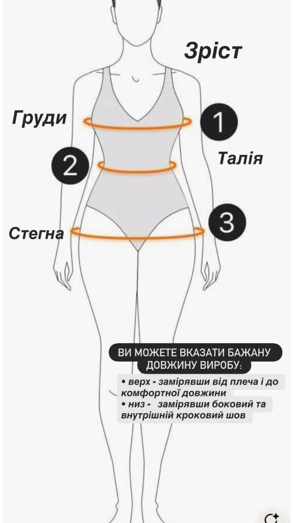 | Розмір | Об'єм грудей | Об'єм талії | Бедра |